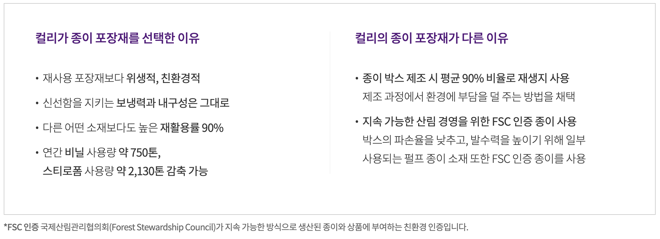 마켓컬리 포장재는 기존 패키지 소재대비 재활용률 90%이며, 연간 비닐 사용량 약 750톤과 스티로폼 사용량 약 2,130톤 감축 가능하도록 기존에 사용했던 재활용이 힘든 포장재 대신 종이 포장재를 마켓컬리에서 사용하고 있따. 사용되는 종이 또한 친환경 산림 인증 FSC 인증 종이를 사용하고 있어, 마켓컬리의 친환경 포장재에서 일회성이 아닌 자연을 위해 노력하는 진심이 느껴진다.